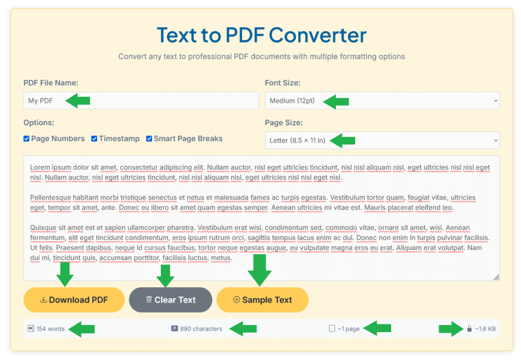 Our Text to PDF Converter lets you fully customize your PDF output. Enable options like Page Numbers, Timestamp, and Smart Page Breaks for professional documents. Adjust the Font Size and select your preferred Page Size. Rename your PDF before downloading, and enjoy the convenience of typing or pasting text directly with a clear input box. At the bottom, track live word count, character count, number of pages, and file size dynamically during your work.